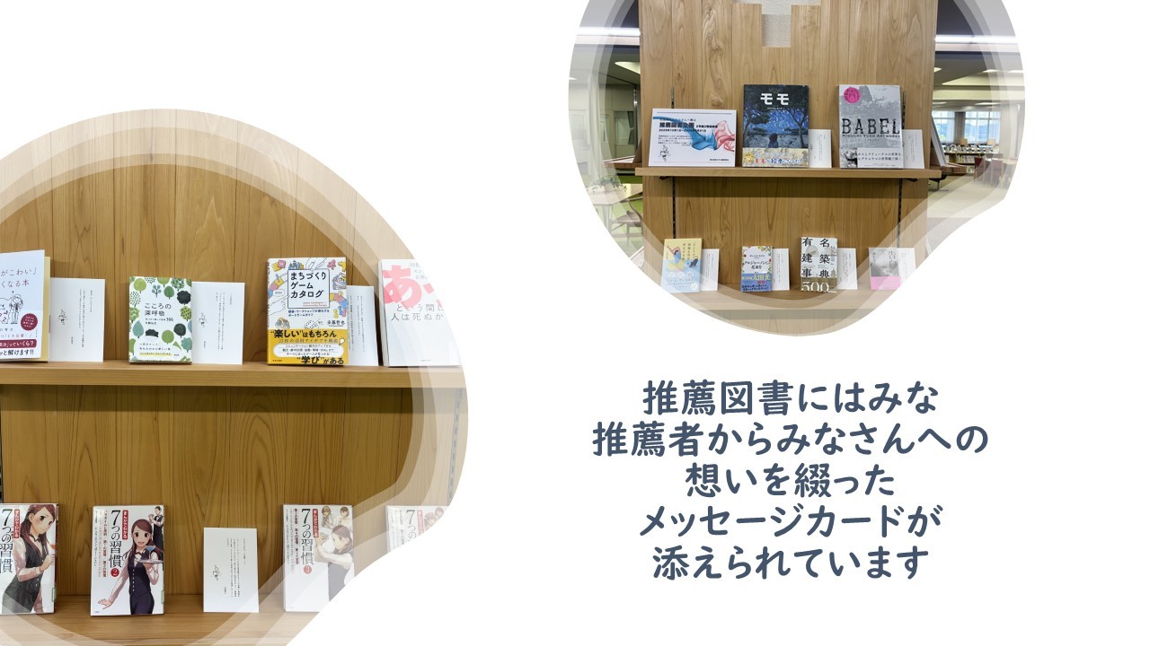 推薦者のメッセージカードを添えて学びの森ラウンジにて展示しております。