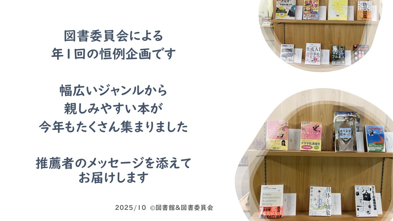図書館では、推薦図書企画「教職員からみなさんへ贈る2025」を開催中。